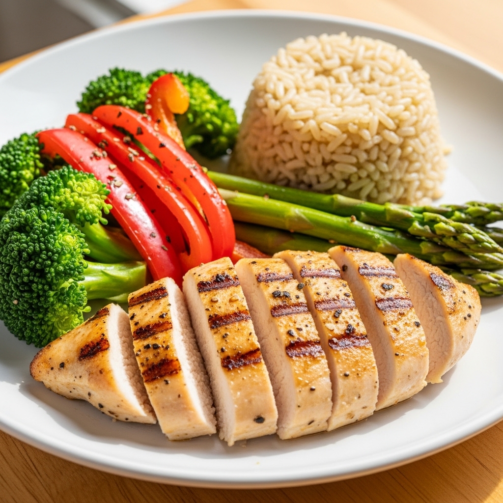 • 닭가슴살과 채소를 곁들인 현미밥: 든든하고 건강한 한 끼 식사로 최고예요.