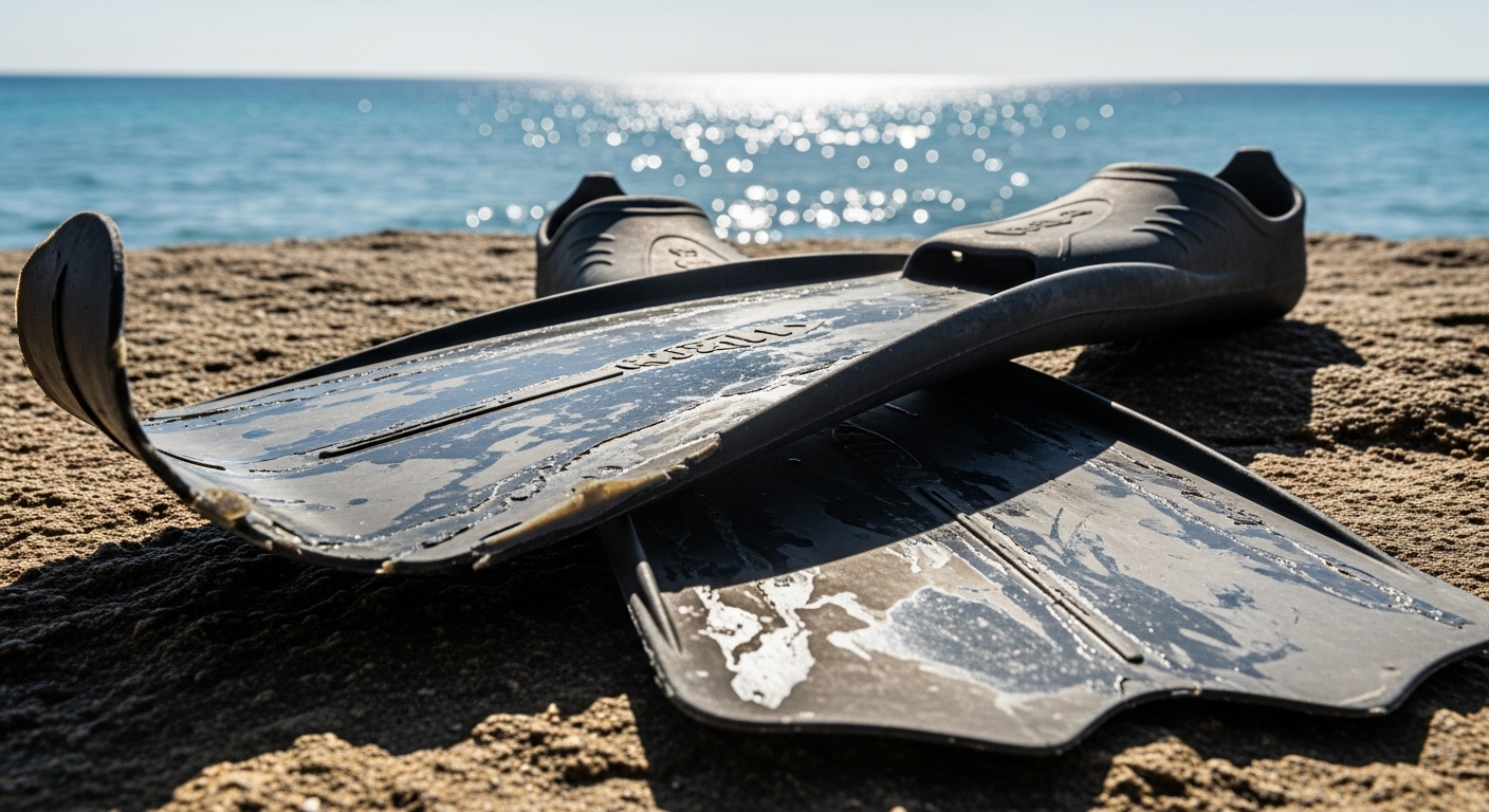 - 신호 2: 깊어지는 흠집과 백화 현상: 특히 카본이나 파이버글라스 핀 표면의 깊은 흠집이나, 하얗게 뜨는 '백화 현상'은 내부 구조가 손상되고 있다는 위험 신호일 수 있습니다.