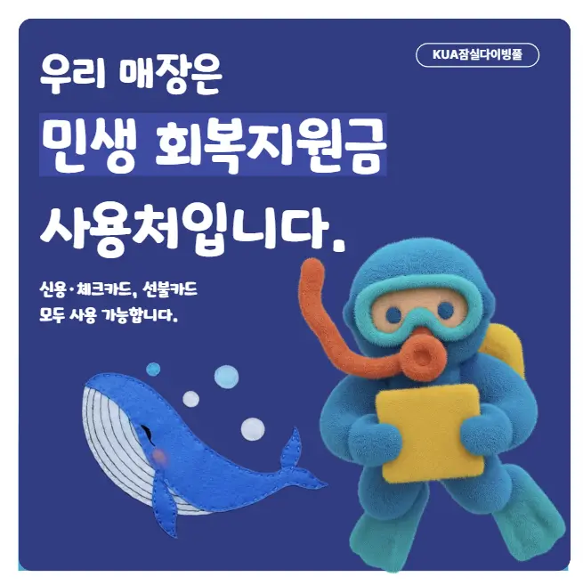 따라서 KUA 잠실 다이빙풀이 지원금이 사용 가능한 지역(서울)에 등록된 사업장이고, 카드 단말기를 통해 결제를 받는 곳이라면 당연히 사용이 가능하답니다. 잠실 다이빙풀은 현장 결제 시스템을 갖추고 있으니, 이 조건에 부합하는 거죠!