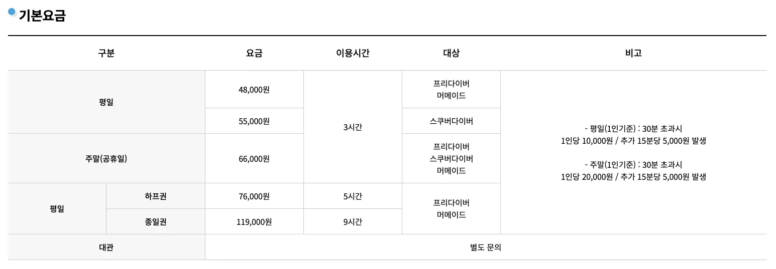 - 레벨 1 / 체험 다이빙: 약 33,000원 (강사 인솔 하에 10m 이내 수심만 이용 가능)