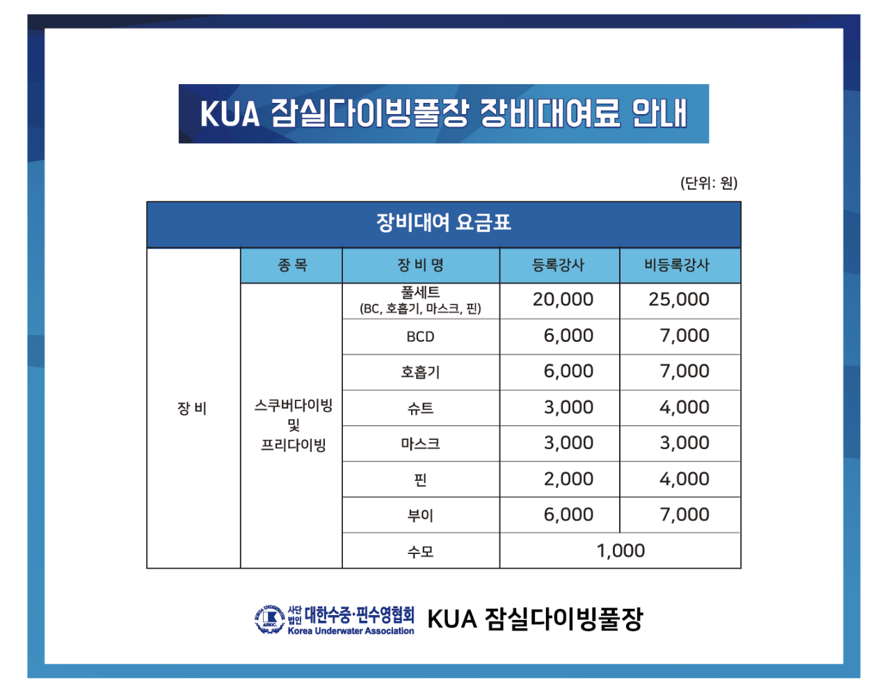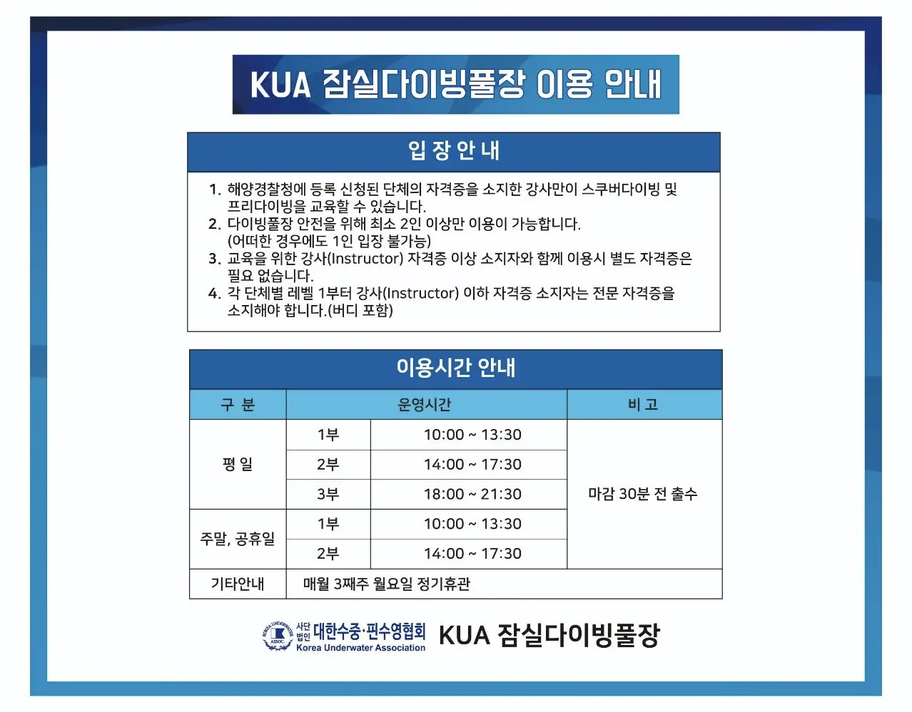 수도권 다이버들의 오랜 훈련장이었던 잠실 다이빙풀! 최근 운영 주체가 KUA(대한수중핀수영협회)로 바뀌면서 이용 방법에 대해 궁금해하는 분들이 정말 많아졌어요. "예약은 어떻게 하지?", "프리다이버도 갈 수 있나?" 등등 여러 질문을 받았답니다.